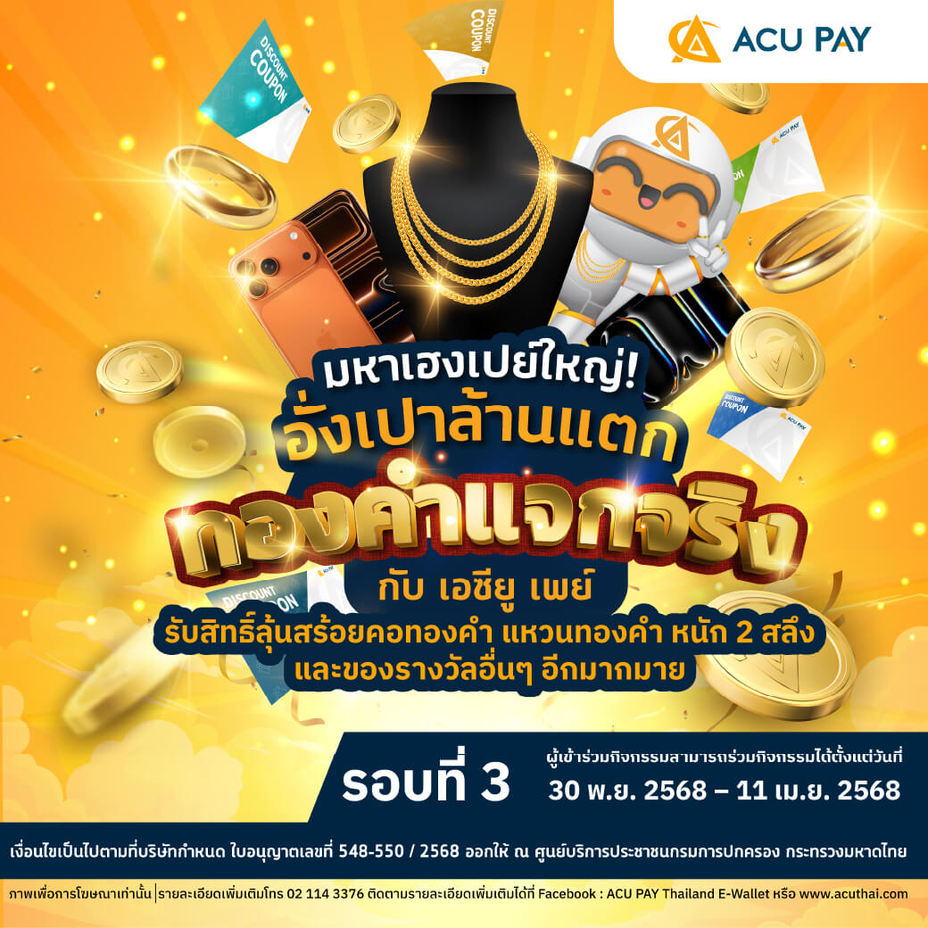 แจกหนัก แจกจริง แจกทอง แจกไอโฟน แจกไอแพด! พร้อมคูปองส่วนลดจากร้านค้าชั้นนำในแอป ACU PAY และคูปองส่วนลดในแอปอีกมากมาย เพียงร่วมสนุกผ่านแอป ACU PAY ก็มีสิทธิ์ลุ้นรับของรางวัลสุดปัง มูลค่ารวมหลายแสนบาท! ยิ่งใช้ ยิ่งลุ้น ยิ่งเปย์ ยิ่งเฮง อย่าพลาดโอกาสทองนี้