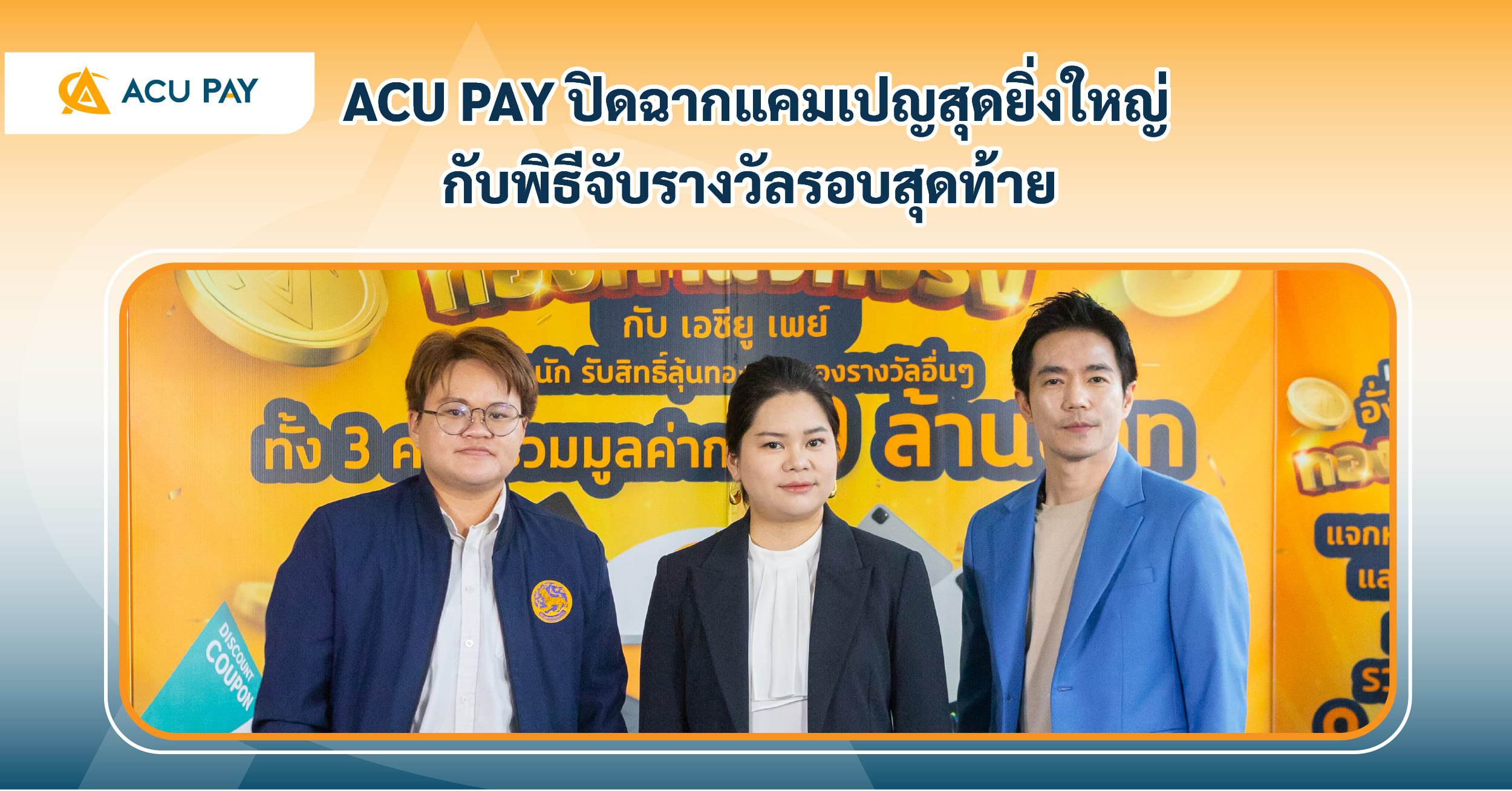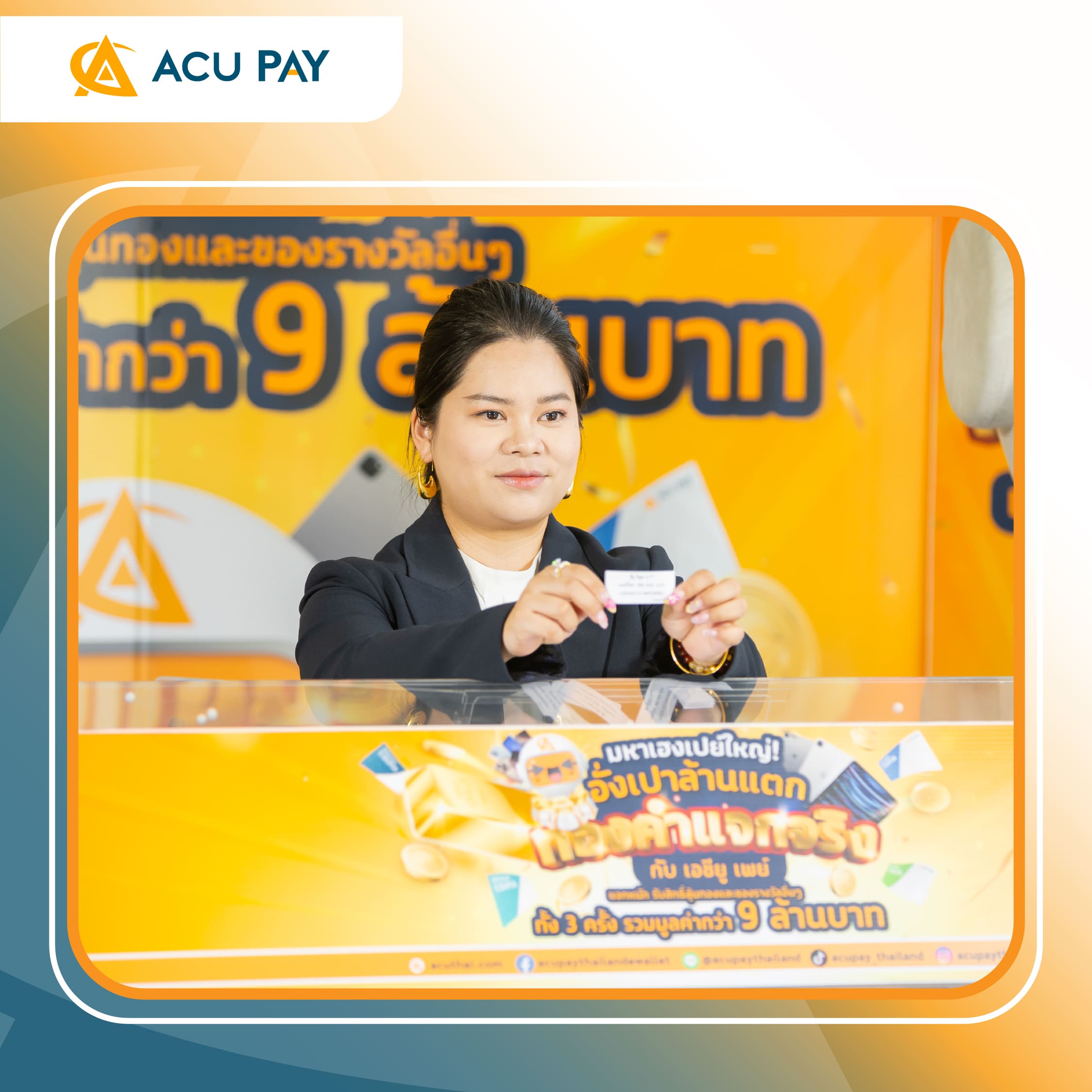 เมื่อวันที่ 17 เมษายน 2569 บริษัท เอซียู เพย์ (ไทยแลนด์) จำกัด ได้จัดงานพิธีจับรางวัลผู้โชคดีในแคมเปญ “มหาเฮงเปย์ใหญ่! อั่งเปาล้านแตก ทองคำแจกจริง กับ เอซียู เพย์ รอบที่ 3” ซึ่งนับเป็น รอบสุดท้ายของกิจกรรมครั้งนี้ โดยบริษัทฯ ได้จัดเต็มรางวัลสุดพิเศษเพื่อตอบแทนผู้ใช้งานแอปพลิเคชัน ACU PAY อย่างต่อเนื่อง ทั้ง สร้อยคอทองคำและแหวนทองคำหนัก 2 สลึง จำนวน 6 รางวัล, iPhone 17 Pro Max จำนวน 2 เครื่อง และ iPad Pro จำนวน 1 เครื่อง ให้แก่ผู้โชคดีที่ร่วมกิจกรรม